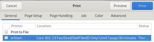 - Only CS Faculty/Grad/Staff NetID can print to this printer. This means that if your username on your computer is NOT CS Faculty/Grad/Staff NetID, you can’t print. In order to print, you must authenticate with your NetID credentials.