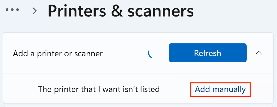 3. Adding a device will search for available local printers and a few seconds later, an option ‘The printer that I want isn’t listed”.
