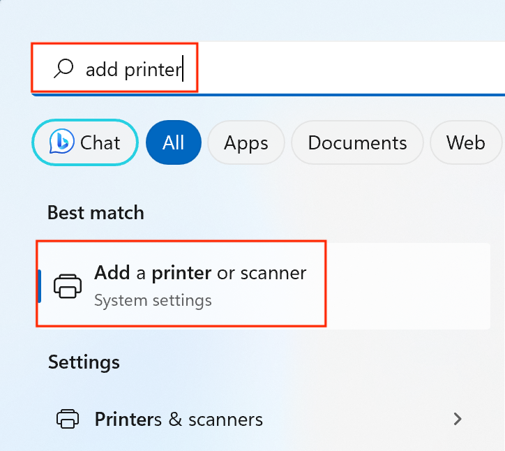 1. To add a printer or scanner, press Black windows logo icon Win, search for add the printer as shown below, and select Add a printer or scanner