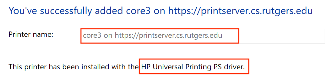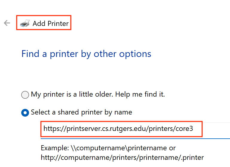 5. In this example, we will setup core3 printer. Enter the address of core3 printers as: https://printserver.cs.rutgers.edu/printers/core3